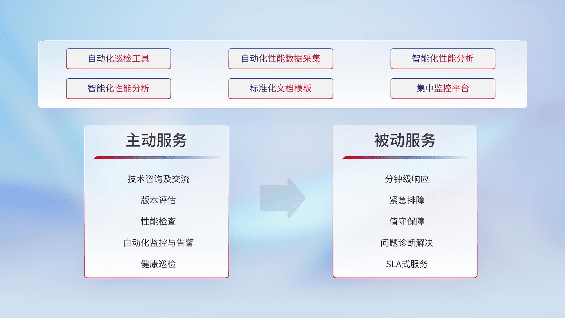 智能化工具和标准化文档,,,保障服务质量,,,,提供主动服务(包含技术咨询、、、、版本评估、、、性能检查、、、自动化监控与告警、、、、健康巡检)和被动服务包含(分钟级响应、、、、紧急排障、、值守保障、、、问题诊断解决、、、、SLA服务)。。。。